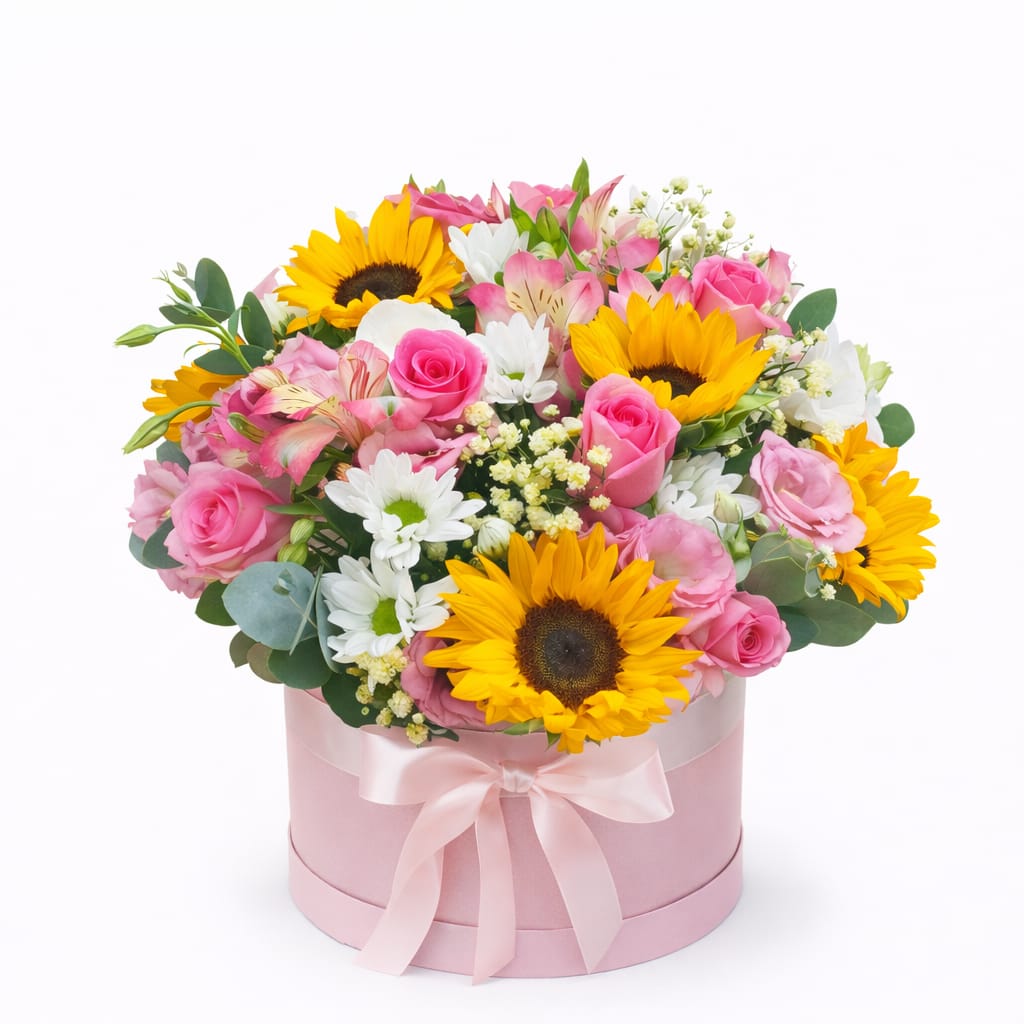 היא חגיגה של אור ושמחה במארז פרימיום אחד. השילוב הנועז בין חמניות זהובות וקורנות לבין ורדים ורודים ורכים יוצר ניגודיות ויזואלית מרהיבה שאי אפשר להתעלם ממנה. הסידור מעוצב בתוך קופסת יוקרה בגוון ורוד פסטל, המעניקה מגע של אלגנטיות ושיק מודרני.