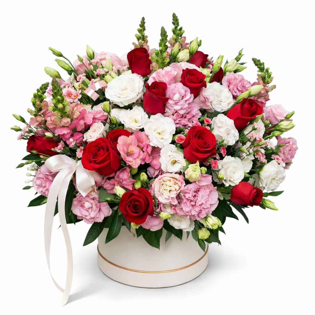 Blanka Luxury Box: Red & Pink היא יצירת אמנות של ממש, המשלבת תשוקה ורכות במארז יוקרתי אחד. הקומפוזיציה עשירה ושופעת, מעוצבת בתוך קופסת פרימיום מעוגלת וכוללת ורדים אדומים קלאסיים, ליזיאנטוס לבן צחור, ציפורן בגווני ורוד עתיק ופרחי מתיאולה ריחניים. זהו סידור פרחים צפוף ומרשים במיוחד, המעניק מראה של עושר ויזואלי ומתאים לאירועים החגיגיים ביותר.