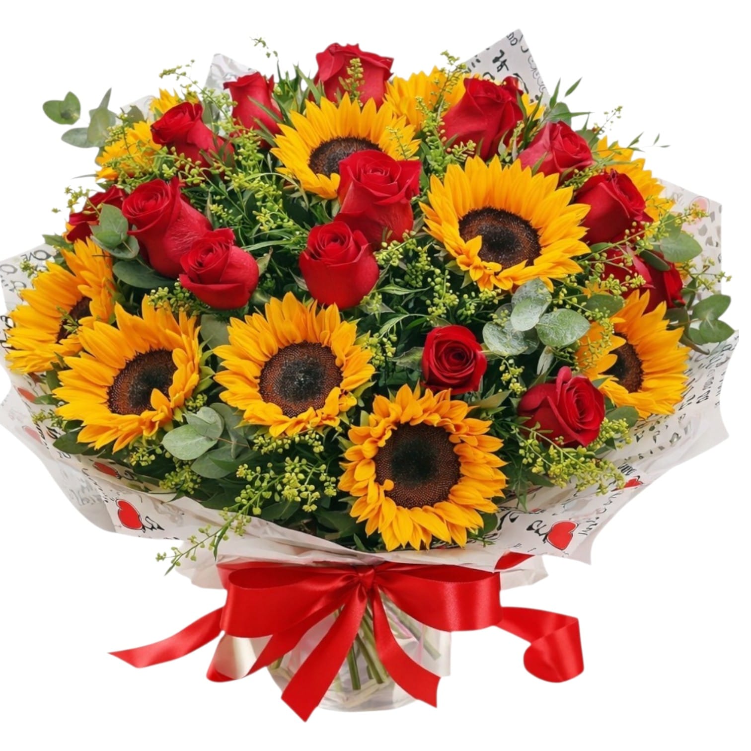 שילוב מרהיב של חמניות מאירות וורדים אדומים קלאסיים.