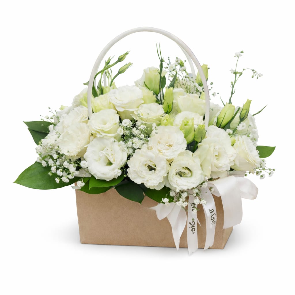 הקומפוזיציה מורכבת מפרחי ליזיאנטוס לבנים וטהורים המעניקים מראה רך ויוקרתי, בשילוב ענני גיפסנית עדינים למראה אוורירי וקליל.